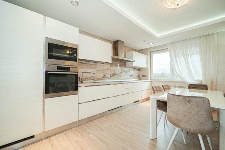 Материал обивки должен быть практичным и легко чиститься, потому что на кухне всегда есть риск что-то пролить. Флок и микрофибра чистятся легче, чем велюр или бархат.
