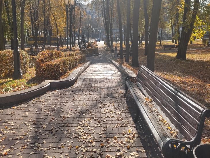 Известно, что обновление парка включало в себя и создание мест для отдыха. Теперь люди могут присесть на удобные лавочки, возле которых имеются урны и фонари.