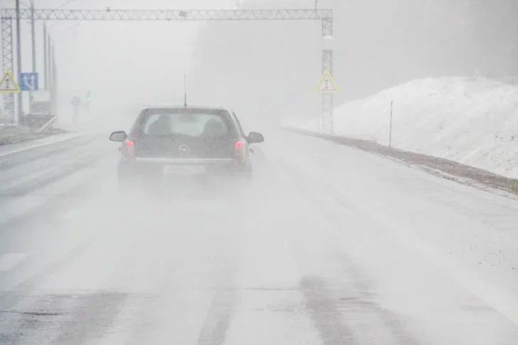 Иномарка оказалась в воде вечером 24 января на фоне сложных погодных условий и затора на дороге.